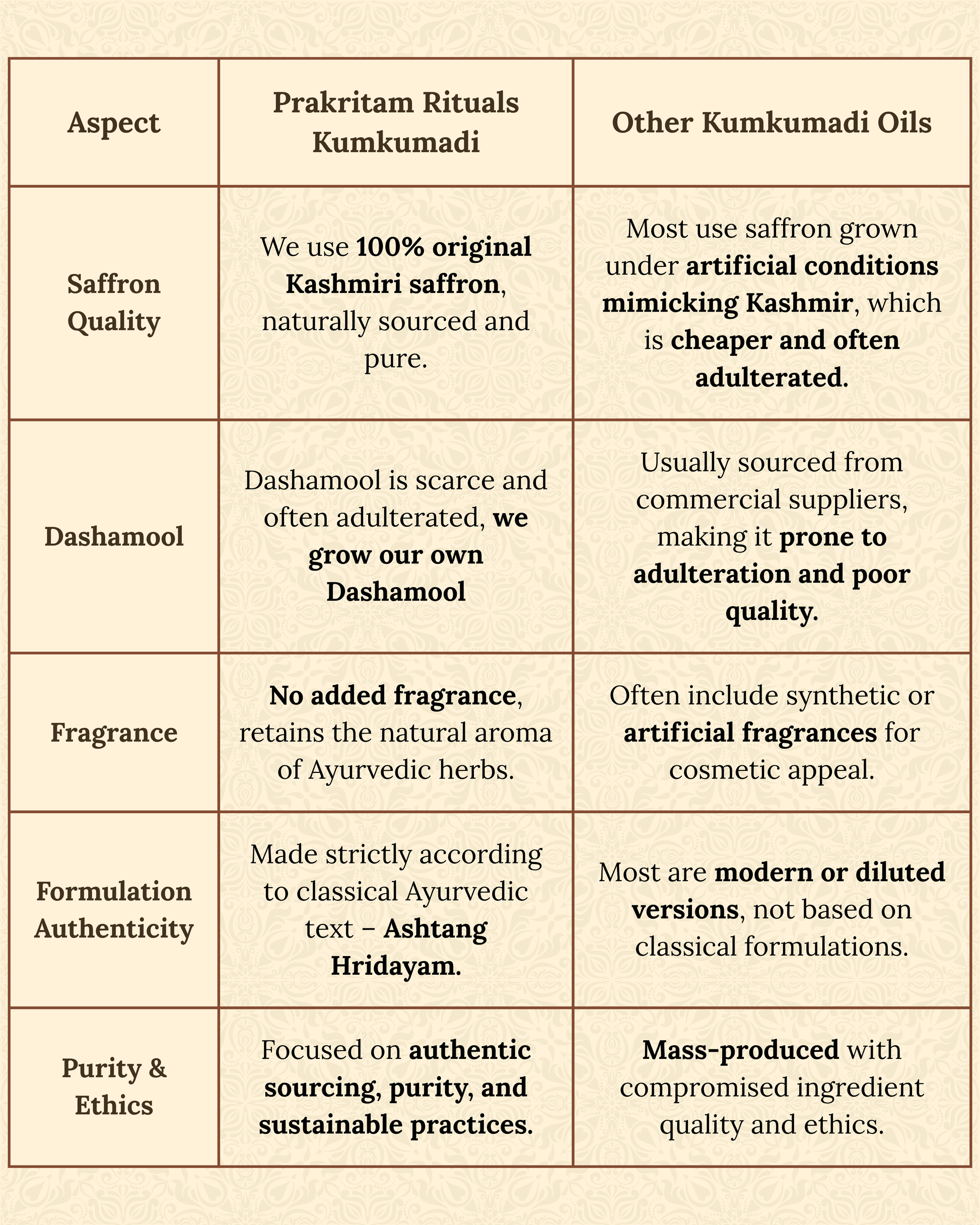 Composition: Kashmiri Saffron (Crocus sativus) Sandalwood (Pterocarpus santalinus) Laksha (Laccifer lacca) Manjishta (Rubia cordifolia) Madhuyashtika (Licorice) Kaliyaka (Berberis aristata) Usheera (Vetiveria zizanioides) Padmaka (Prunus cerasoides) Goat milk Gokshura (Tribulus terrestris) Prinshnaparni (Urarica picta) Shalaparni (Desmodium gangeticum) Neelotpala (Nymphaea stellata) Plaksha (Ficus lacor) Kamala keshara (Pollen of Lotus) Nyagrodha (Ficus bengalensis) Dashamoola (Group of ten roots) Bilva (Aegle marmelos) Agnimantha (Premna mucronata) Shyonaka (Oroxylum indicum) Gambhari (Gmelina arborea) Patala (Stereospermum suaveolens) Brihati (Solanum indicum) Kantakari (Solanum xanthocarpum) Water (Aqua) Pattanga (Caesalpinia sappan) Madhuka Yastimadhu