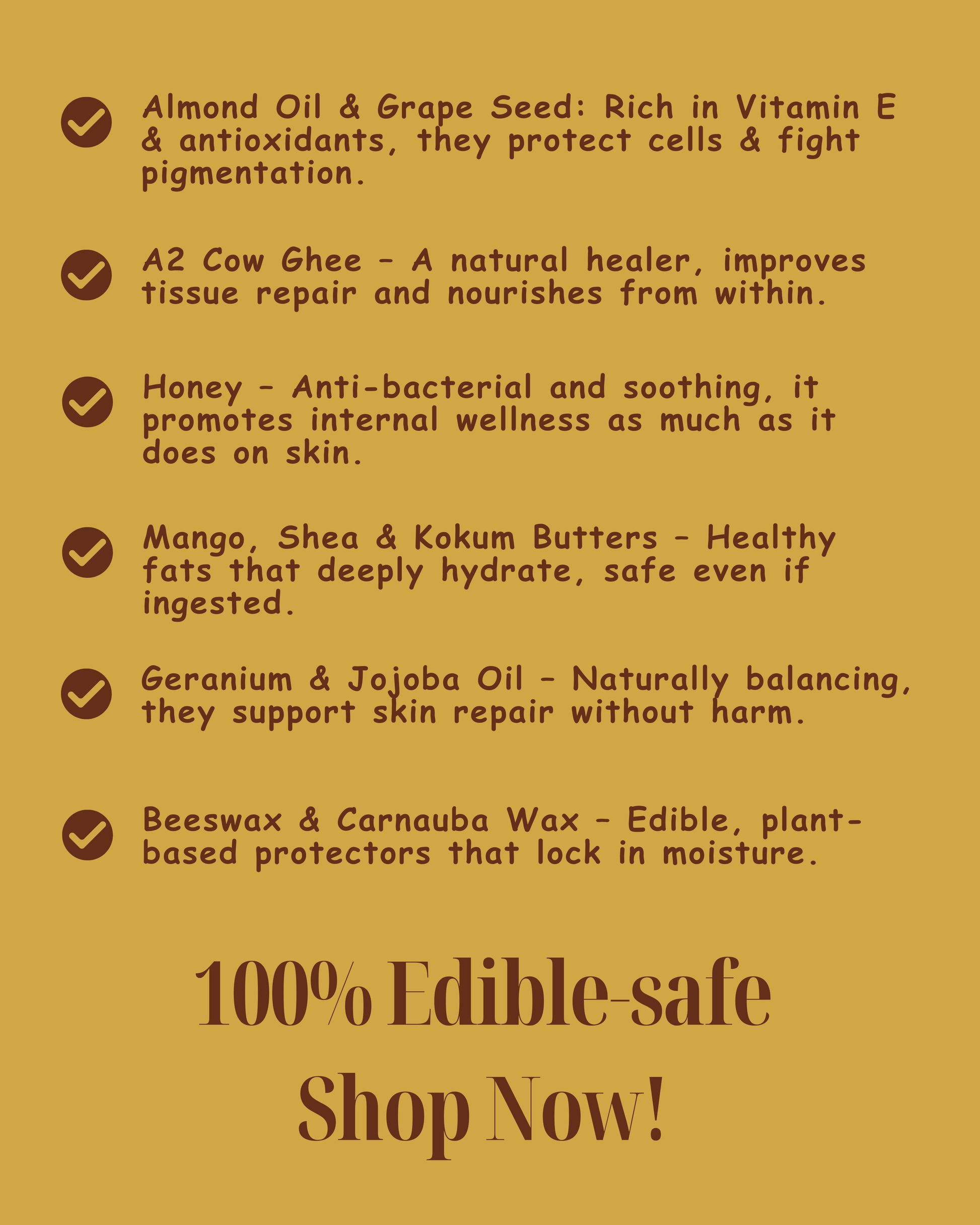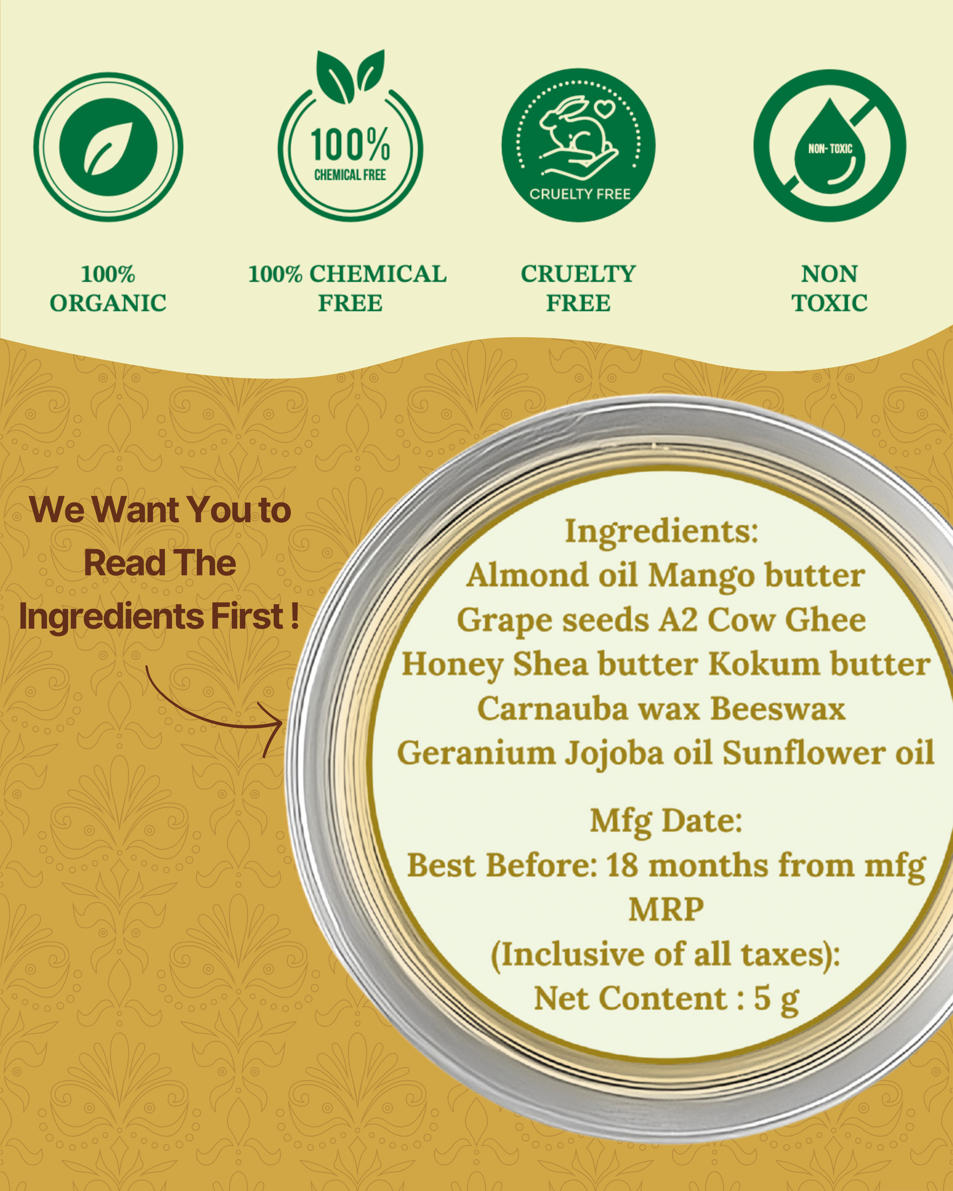 Ingredients: Almond Oil | Mango Butter | Grape seeds | A2 Cow Ghee | Honey | Shea Butter | Kokum Butter | Carnauba wax | Beeswax | Geranium | Jojoba Oil | Sunflower Oil